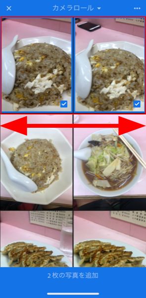連続した複数の写真を選択する場合、画面の左右を端から端にスワイプします。