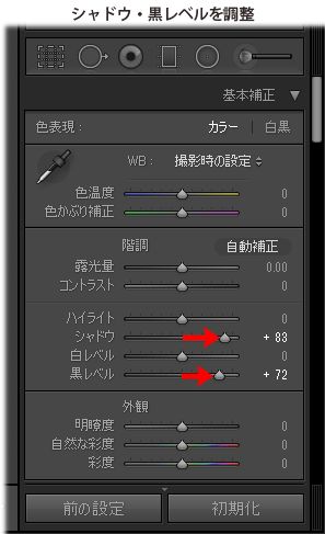 2. 黒つぶれを補正するには、右側の基本補正パネルで「シャドウ」と「黒レベル」のスライダーを右側に移動し値を上げます。