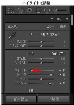 4. 「ハイライト」を調整します。軽度の白飛びがある場合、ハイライトを調整することで細部が復元されます。
