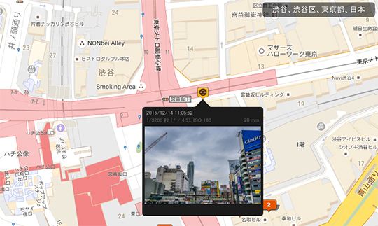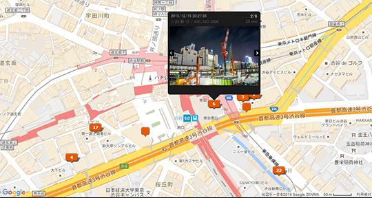 地図上に目印が追加されます。マウスカーソルを合わせると写真が表示されます。