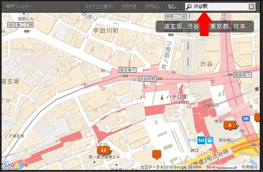 画面右上の検索フィールドに、撮影した場所の地名や番地などを入力して Enter キーを押します。