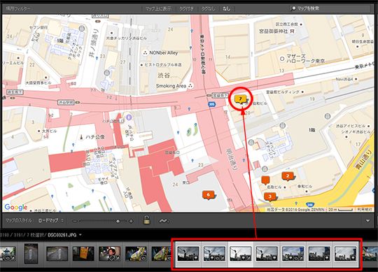 フィルムストリップの写真を地図上にドラッグ&ドロップすることで地図情報を追加することもできます。この操作で、同じ場所で撮影した複数の写真に一括で位置情報を追加できます。