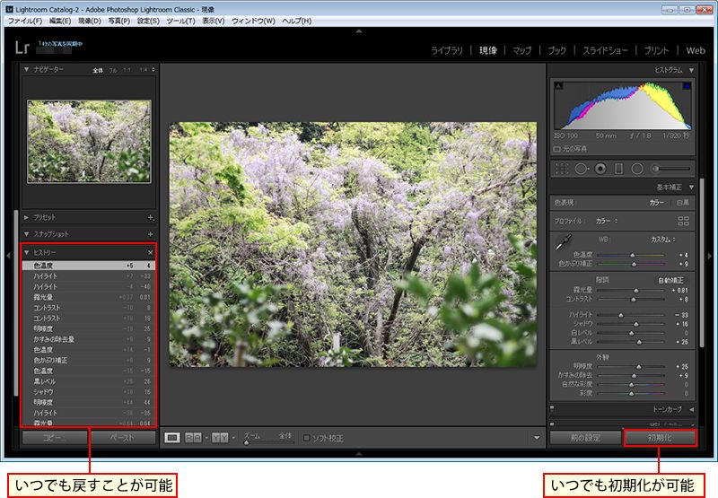 Lightroom は、RAW データでも JPEG ファイルでもすべて非破壊環境で画像編集を行うことができます。非破壊編集とは、元画像のピクセルを直接編集せずに補正の値を記録したデータをカタログ上の画像に適用している状態です。つまり補正情報を記録した透明のフィルムを適用しているようなイメージです。そのためどんなに編集を繰り返しても画質が悪化することはなく、いつでも元画像に戻したり作業をさかのぼることができます。