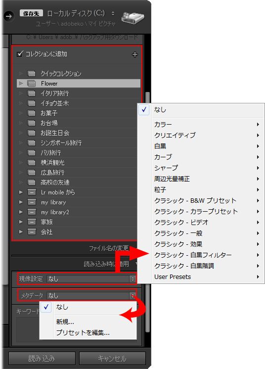 Lightroom Classic CC では、写真の読み込み段階でキーワードや著作権情報などを設定したり、現像プリセットを適用したり、写真をコレクションに振り分けることができます。読み込み段階でさまざまな情報を設定できるのでその後の作業が効率的に進みます。