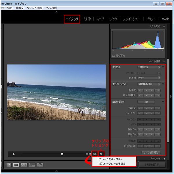 Lightroom では、写真と同じように動画を読み込むことができます。ライブラリモジュールのクイック現像で簡単な補正や、クリップのトリミング、フレームの書き出し、グリッド表示に表示されるサムネイルの変更などが可能です。写真同様、ラベルやフラグ、レーティング、キーワードを設定することができます。