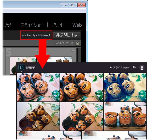 コレクションを公開することで Lightroom web ギャラリーを通してコレクションの写真を複数の人に共有することができます。コレクションを公開し、発行される専用の URL を他人に教えることで、だれでも写真の閲覧および保存が可能です。