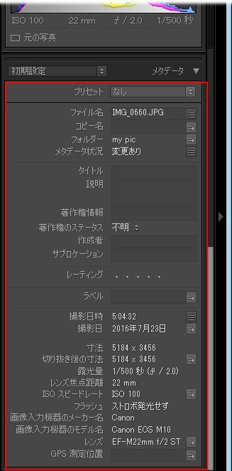 写真のメタデータ項目には、ラベルやレーティング、撮影日時、寸法、使用したカメラやレンズ、撮影された写真の ISO 感度、シャッタースピードなど、自分の所有するカメラで撮影された写真には一枚一枚詳細なメタデータが表示されます。