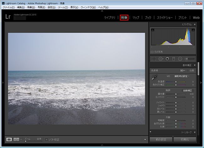 1. Lightroom を起動し、空の色を補正する写真を現像モジュールで開きます。