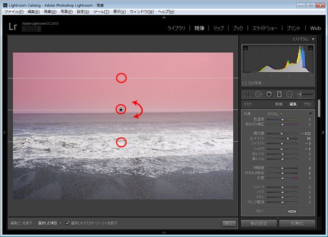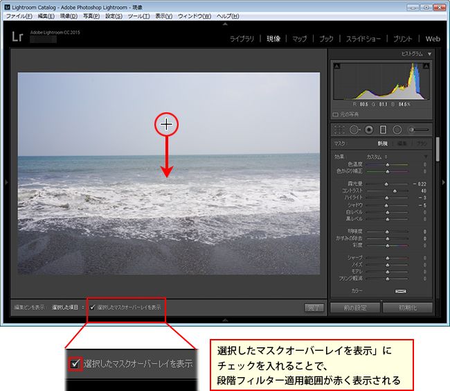 3. 画面下部の「選択したマスクオーバーレイを表示」にチェックを入れ、補正する空の領域を上から下へドラッグします。