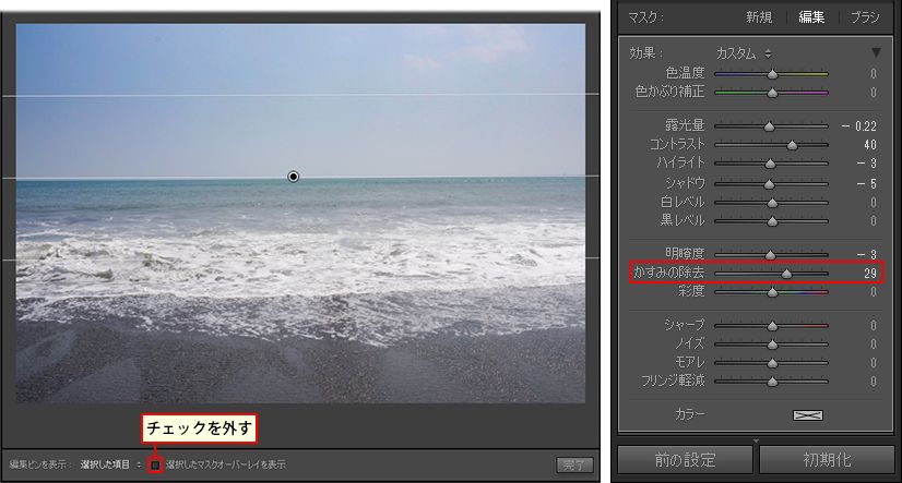 5. 「選択したマスクオーバーレイを表示」のチェックを外し、基本補正から「かすみの除去」を調整します。