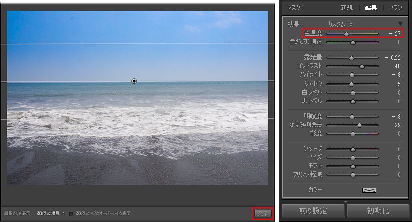 6. より青くする場合は、「色温度」を左側へ調整します。不自然にならないよう、確認しながら少しずつ調整します。