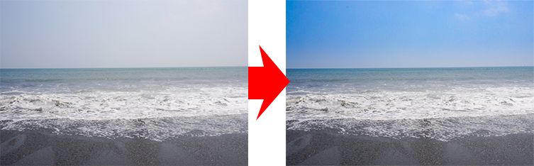 かすみが取れてくっきりすることで空の青さが自然に際立ち、ディテールも復元します。