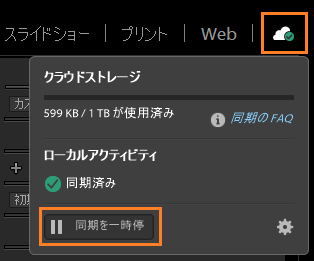 Lightroom Classic で同期を一時停止するには、モジュール切り替えコントロールの横にある同期アイコンをクリックし、ポップアップで「同期を一時停止」をクリックします。