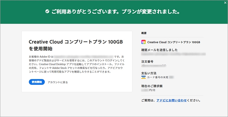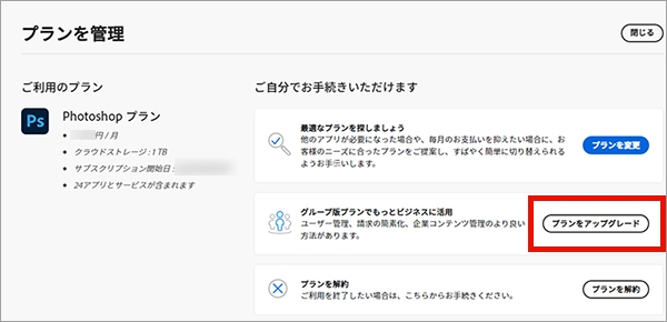 アドビから購入したプランは、アドビのアカウントページで変更できます。