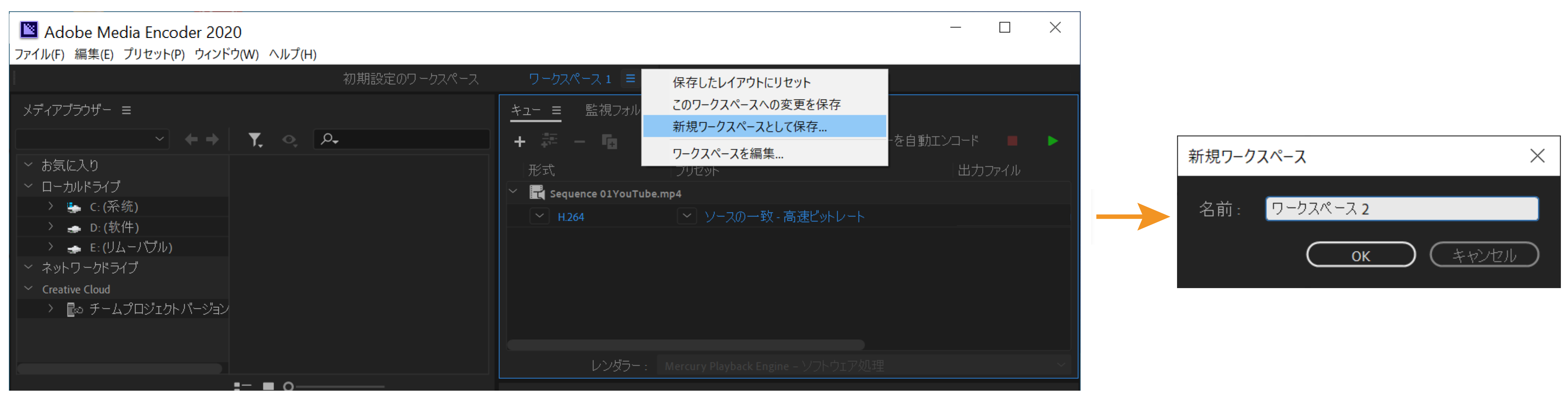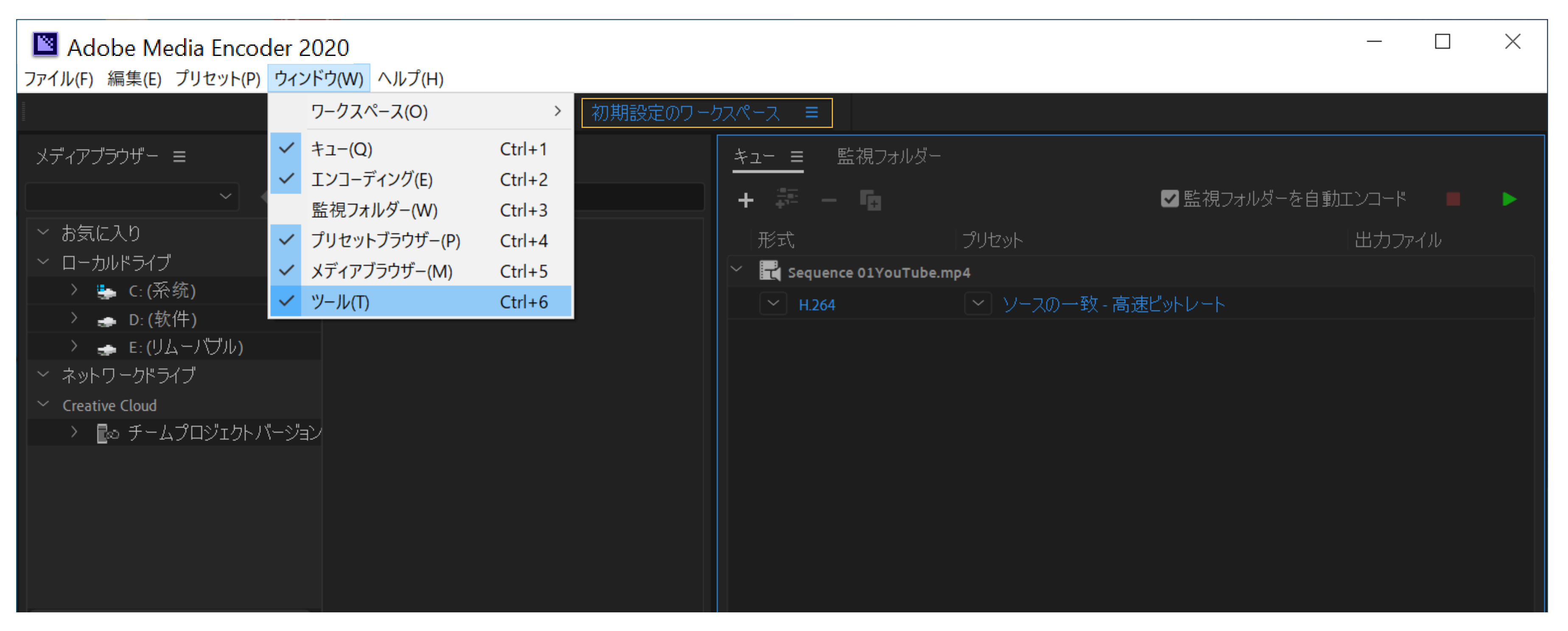 Adobe Media Encoder のワークスペース