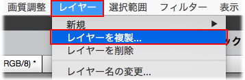 e. レイヤーを複製します。レイヤーパネルでレイヤーを選択し、レイヤー/レイヤーを複製 を選択するか、レイヤーパネル上部にある「新規レイヤーを作成」に選択したレイヤーをドラッグします。
