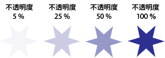 レイヤーの不透明度によって、1 つ下のレイヤーが透けて見える度合いが決まります。不透明度が 1 %のレイヤーは、ほとんど透明になります。不透明度が 100 %のレイヤーは、完全に不透明になります。透明部分は、不透明度の設定に関係なく透明のままとなります。