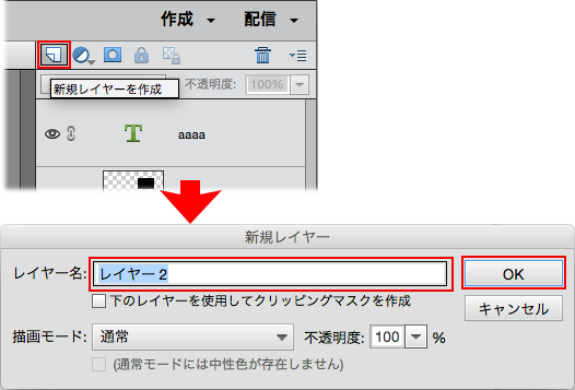 a. 新しい透明のレイヤーを作成するには、レイヤーパネル上部の「新規レイヤーを作成」アイコンをクリックするか、レイヤー/新規/レイヤー を選択します。新規レイヤーダイアログボックスでレイヤー名を入力し、「OK」をクリックします。