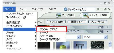 [フィルタ] メニューの [シャープ] をポイントし、 [アンシャープマスク] をクリックします。