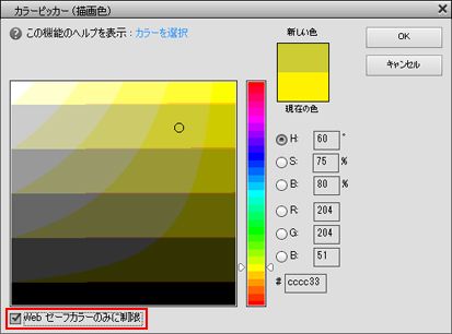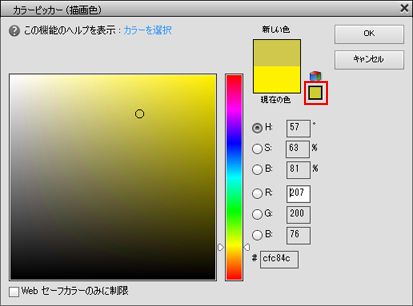 - カラーピッカー内で選択したカラーが Web セーフカラー以外であった場合、選択したカラーの右上あたりに立方体の記号が表示されます。この記号をクリックすると、選択したカラーに最も近い Web セーフカラーが自動的に選択されます。