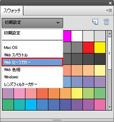 「スウォッチ」パネルでは、パネルの左上にあるプルダウンメニューから 「Web セーフカラー」を選択すると、Web セーフカラーに置き換わります。