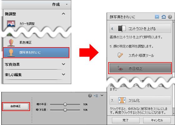 ウィンドウ右側から微調整/顔写真をきれいに をクリックします。表示された手順を必要に応じて行っていき、「赤目修正」ボタンをクリックします。その後、ウィンドウ下部に表示されている「自動補正」ボタンをクリックします。