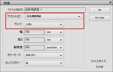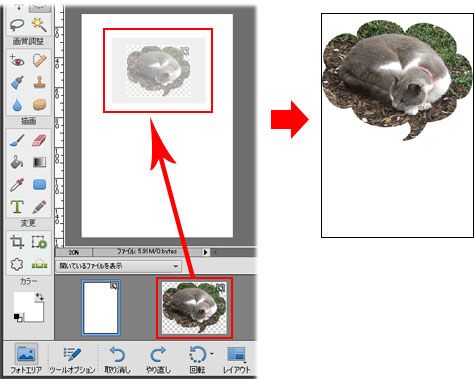 必要に応じて、イメージ/サイズ変更 から写真サイズを調整したり、選択ツールや型抜きツールなどで配置する写真の形を変更しておきます。