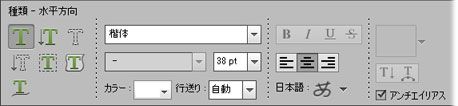 縦書文字ツールなど文字ツールの種類の選択、フォントの種類やサイズを設定します。