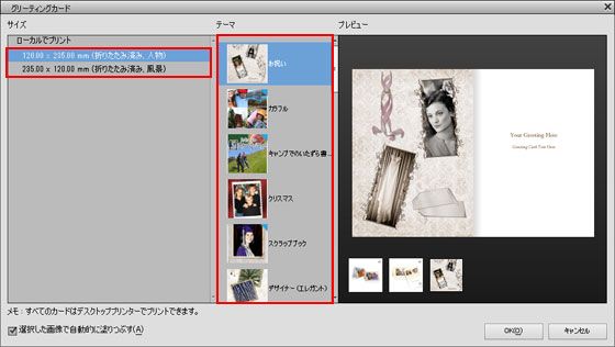 グリーティングカード ダイアログボックスが表示されたら、サイズ、テーマを選択して「OK」をクリックします。