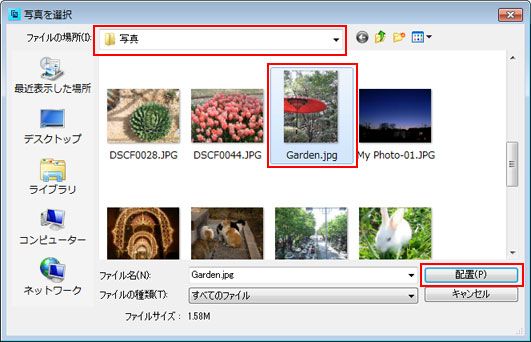 写真を選択 ウィンドウで埋め込む写真が含まれているフォルダーを開き、写真を選択して「配置」ボタンをクリックします。