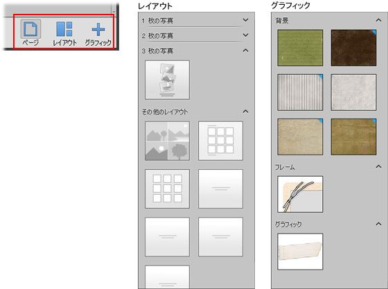 必要に応じて、レイアウトおよびグラフィックを選択して、レイアウト変更やグラフィック追加を行います。レイアウトやグラフィックは、プレビュー画面上にドラッグすると適用されます。- ページ