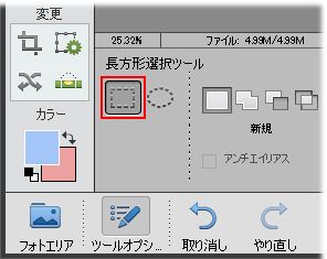 注意:楕円形選択ツールが表示されている場合は、選択後、画面下のツールオプションで長方形選択ツールに切り替えます。