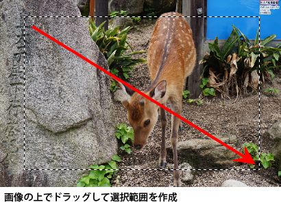 画像内をドラッグし、画像の内側に長方形の選択範囲を作成します。この選択範囲の外側がぼかしを適用する対象となります。