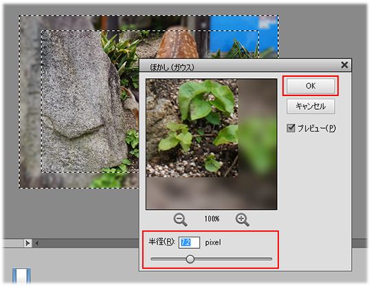 ぼかし(ガウス)ダイアログボックスが表示されたら、プレビュー画像を確認しながら半径スライダーを動かし、ぼかしの強さを調整します。調整が完了したら、「OK」をクリックします。
