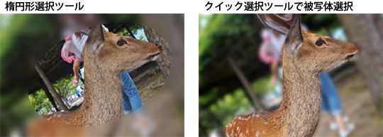 上記手順で説明したパターンだけでなく、楕円形選択ツールを使用したりクイック選択ツールで被写体のみ範囲選択して上記の手順でぼかしを適用したり、ぼかしの強さや範囲を変えてみたりすると、また違った印象になります。