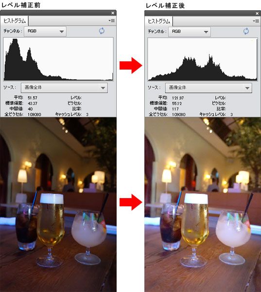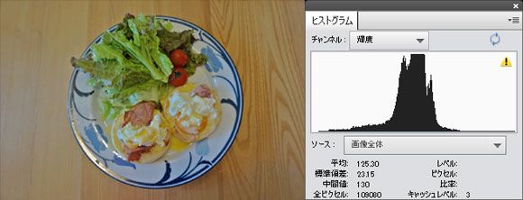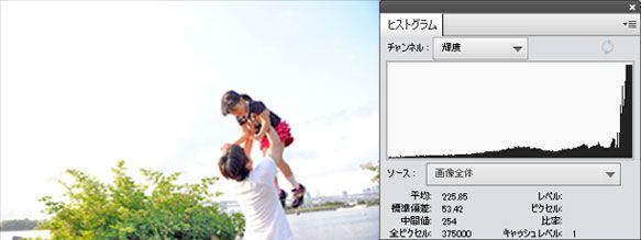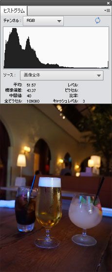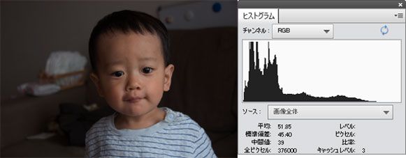 ヒストグラムを表示して確認します。左に偏っていたヒストグラムが分散され、適切な明るさの写真に補正されました。