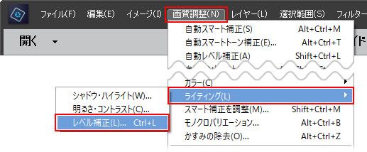 [画質調整] メニューから [ライティング] にカーソルを合わせ、[レベル補正] をクリックします。