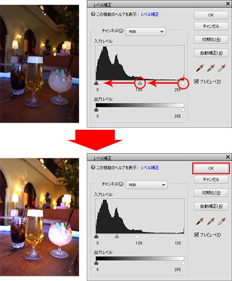 明るくするので、写真を確認しながらヒストグラムの右側(ハイライト)の三角を左側へ移動します。これだけでも全体が明るくなりますが、真ん中(中間調)の三角を左へ少し移動すると、さらに明るくなります。