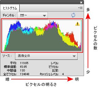 画像は「ピクセル」という画像を構成するひとつの単位(点)の集まりで成り立っています。ヒストグラムは、その「点」の色の明るさをレベル別に分布したグラフです。ヒストグラムを見ればその画像の明るさの傾向をある程度把握することができます。
