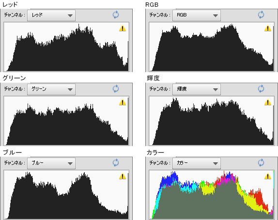 ヒストグラムが開きました。初期設定ではカラーのヒストグラムが開きます。