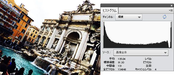 一番明るい部分と暗い部分の左右にピクセルが集中している。中間色がほとんどなく、明暗の差がはっきりしすぎている。
