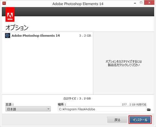 スタートアップスクリーンが表示されたら、[adobe photoshop elemnts 14 をインストール] をクリックします。