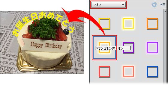 ※ ここではプルダウンリストから「ネオン」を選択し、「ネオン(オレンジ)ー オン」を適用します。