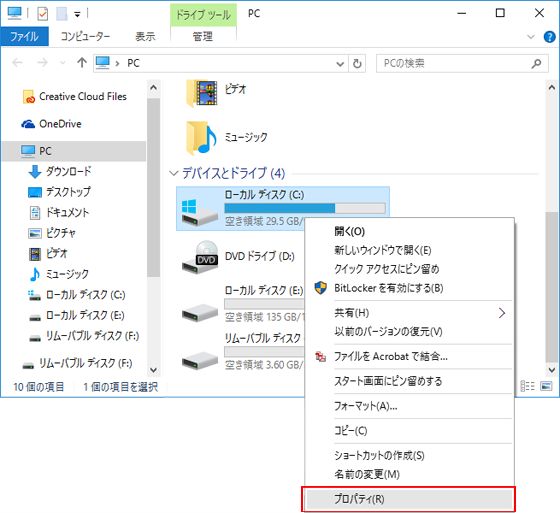 エラーチェックを行うハードディスクを右クリックして「プロパティ」を選択します。