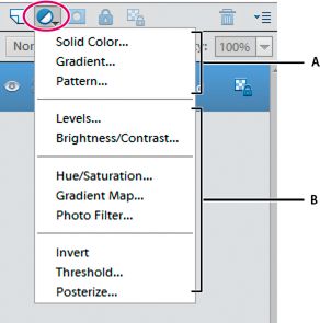 レイヤーパネルにある塗りつぶしまたは調整レイヤーを新規作成ボタンをクリックし、作成する塗りつぶしタイプを選択します。(パネルに表示される最初の 3 つのオプションは塗りつぶしレイヤーで、他のオプションは調整レイヤーです)。