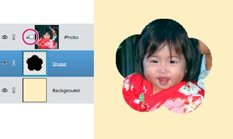 レイヤーパネルで、グループ化する 2 つのレイヤーの上の方のレイヤーを選択し、レイヤー/クリッピングマスクを作成を選択します。