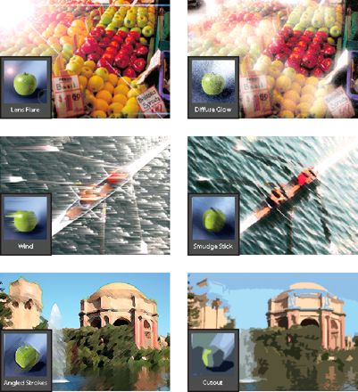 フィルターの使用結果をプレビューします。大きな画像にフィルターを適用すると、処理に時間がかかることがあります。フィルターギャラリーでフィルターの使用結果をプレビューすることで、フィルターのエフェクトをすばやく確認できます。また、ほとんどのフィルターは、フィルターオプションダイアログボックスおよびドキュメントウィンドウで使用結果をプレビューすることができます。結果を確認した後でフィルターを適用するか操作をキャンセルできるので、時間を節約できます。