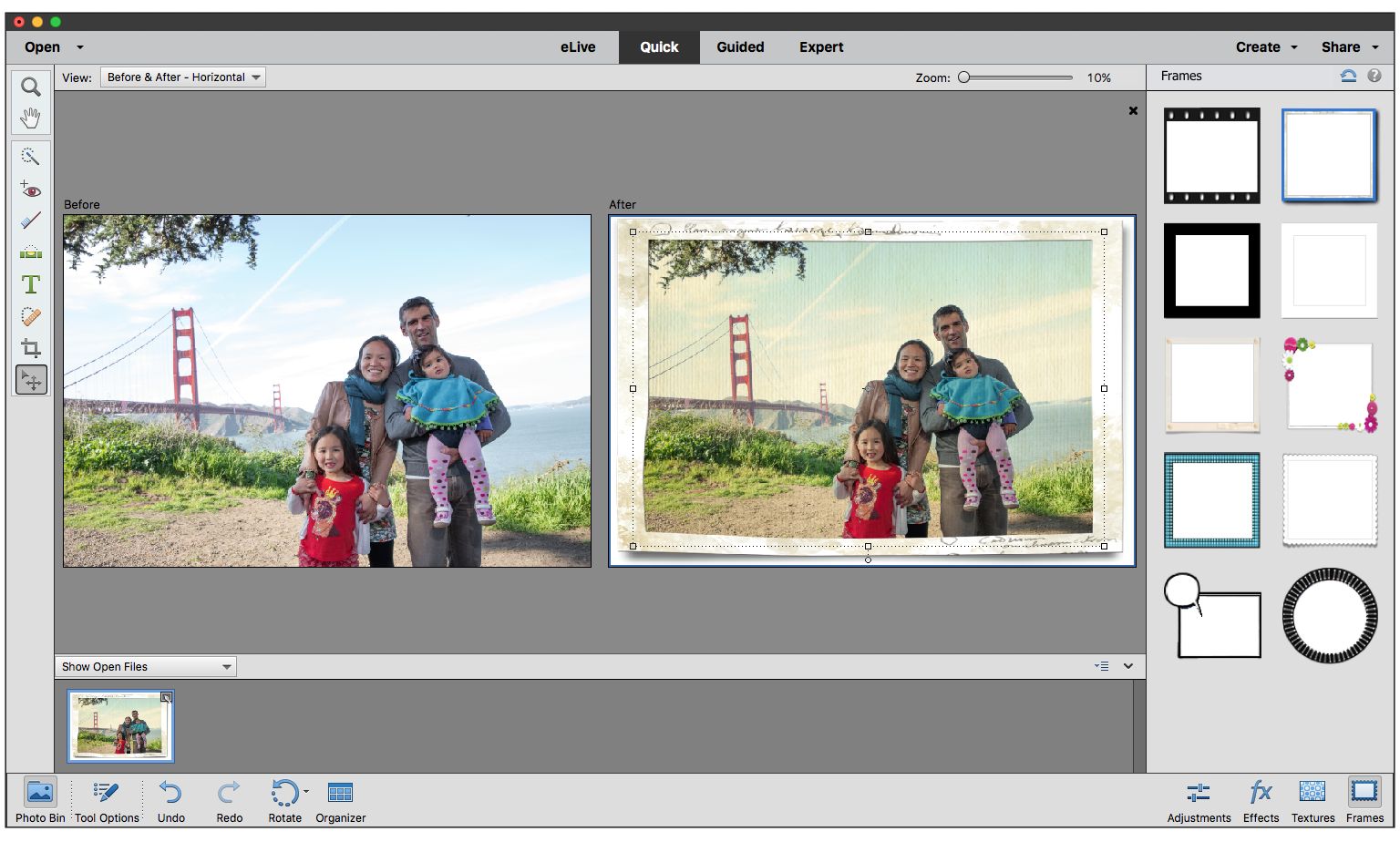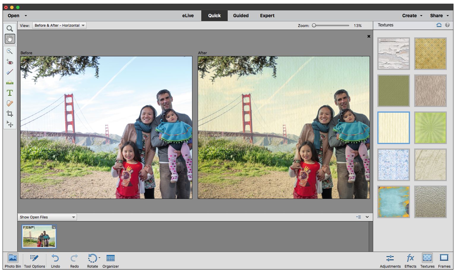 クイックモードでは、露光量、カラー、シャープ、画像のその他の側面をすばやく補正するため、基本的な写真補正ツールを 1 箇所にまとめています。Photoshop Elements 12 では、写真の補正だけではなく、プロが制作した芸術作品のように写真を変換することができます。新しい 3 つのパネル、効果、テクスチャ、フレームを利用できるようになりました。