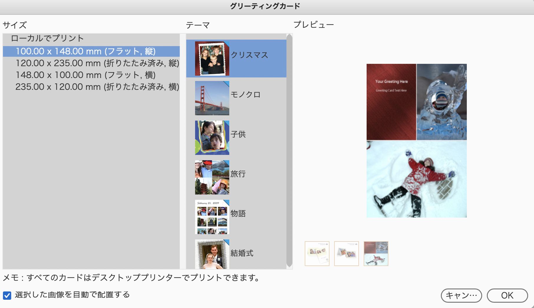 - レイアウト:グリーティングカードのレイアウトが表示されます。