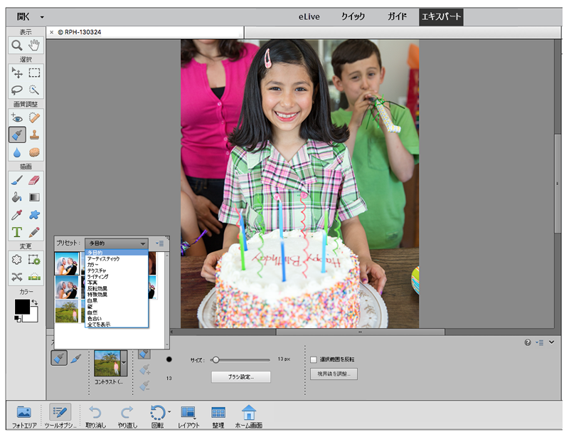 スマートブラシツールと詳細スマートブラシツールは、写真の特定領域に色調およびカラーの調整を適用します。このツールを使用して、特定のエフェクトを適用することもできます。プリセットの調整を選択して、補正を適用します。このツールは自動的に調整レイヤーを作成します。また、元の画像レイヤーが変更されないため、柔軟に写真を処理できます。さらに、画像情報が失われないので、画像を調整前の状態に戻して調整することもできます。